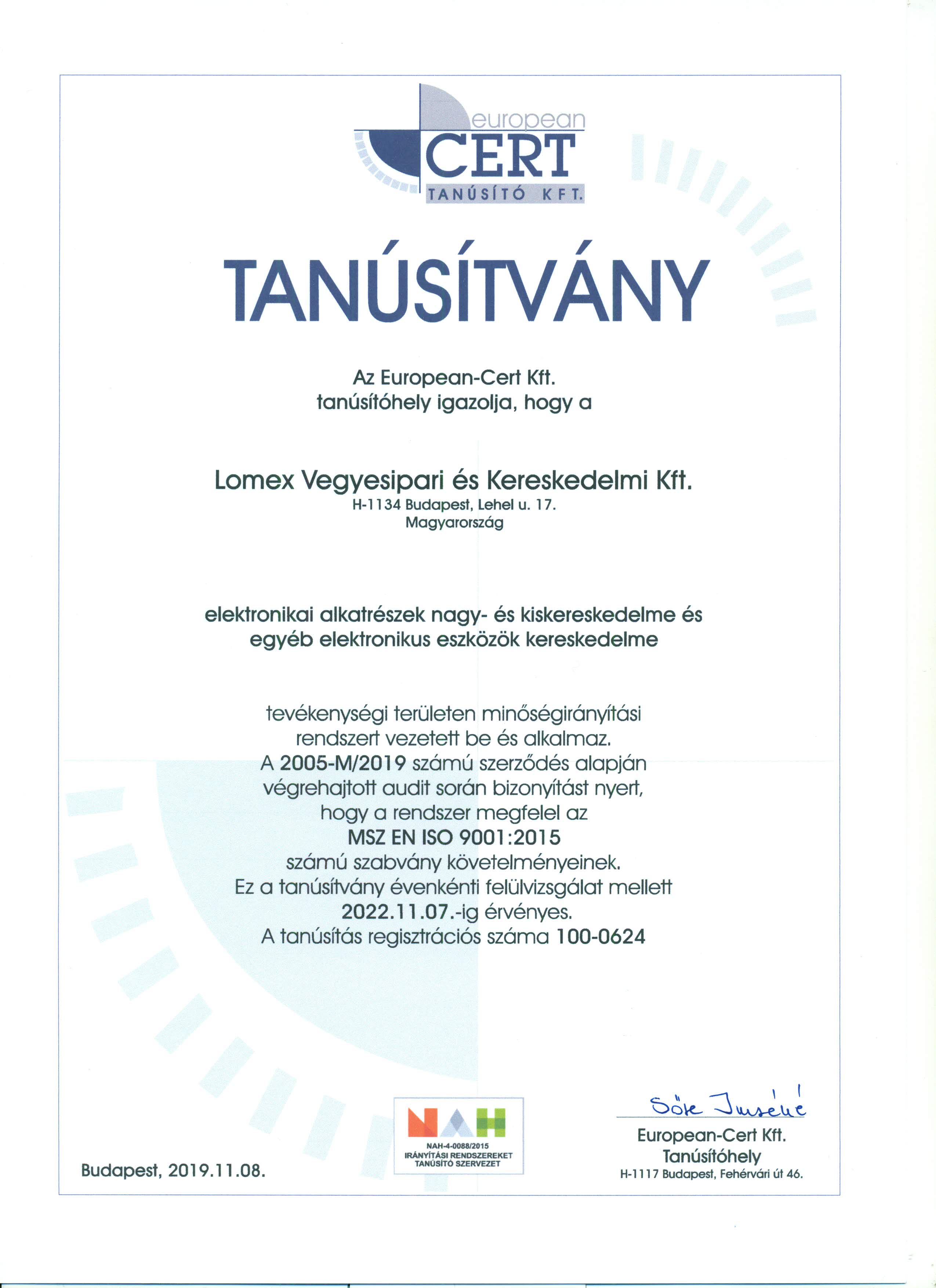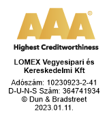 A LOMEX Kft. a Bisnode AAA (tripla A) tanúsítványát kapta meg, mellyel Magyarországon csupán a cégek 0,63 %-a rendelkezik, és azt jelzi, hogy velünk az üzleti kapcsolat kialakításának pénzügyi kockázata rendkívül alacsony.